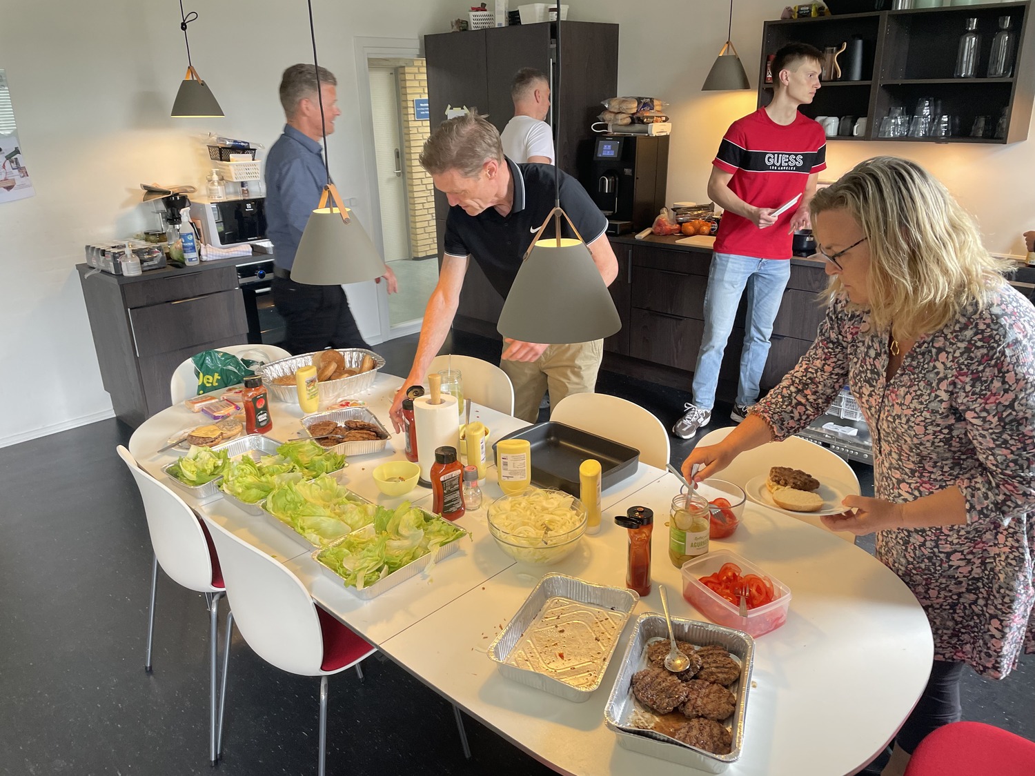 Sammen med vores fantastiske lejere fra Vincent Consulting, holder vi - typisk i starten af sommeren - en årlig "Burger-dag", hvor vi griller lækre burgere til frokost på kontorhotellet. Stemningen er altid i top, og det er en kærkommen mulighed for at samles i en travl hverdag.