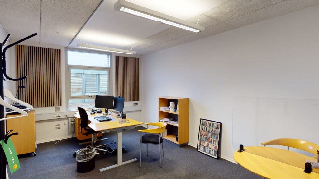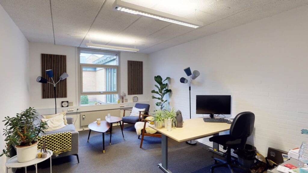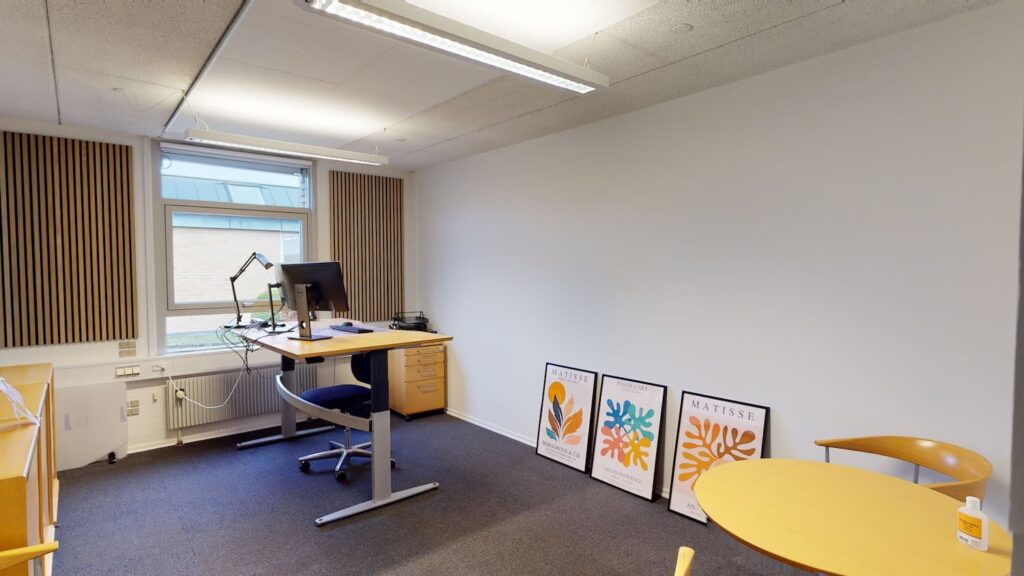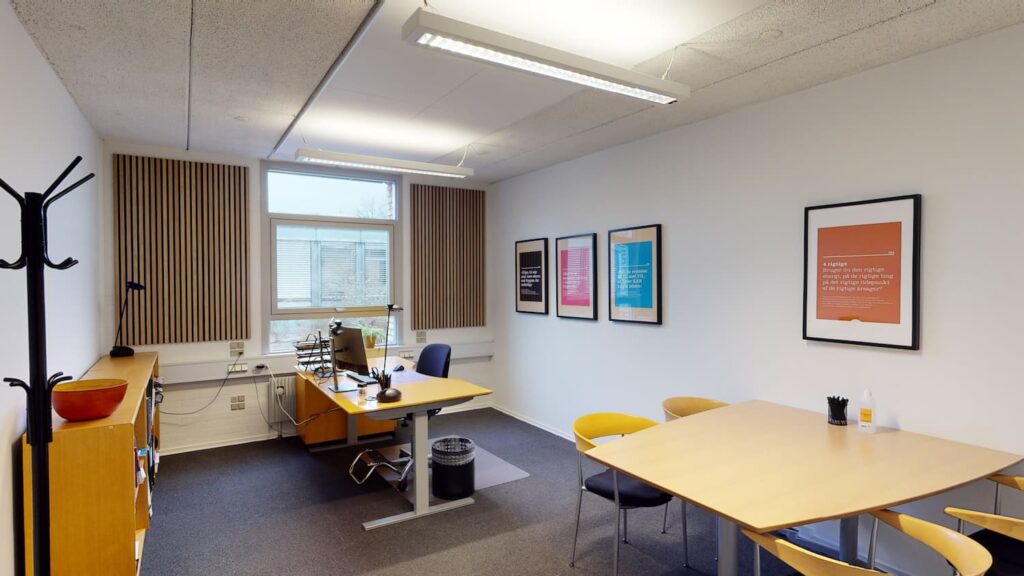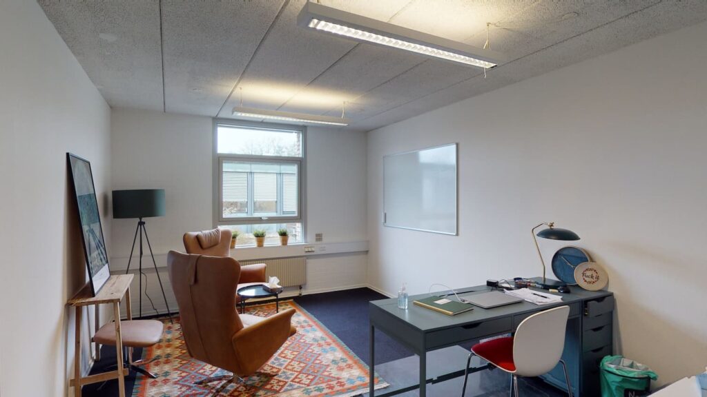 Rummet fremstår stilrent og elegant med hvide vægge, gråmelerede flisetæpper og valnøddefarvede akustikpaneler, som sikrer god akustik i rummet. Rummet egner sig både til den selvstændige konsulent, som ønsker plads til at kunne afholde møder med kunder på eget kontor, og virksomheder med op til 4 medarbejdere.
